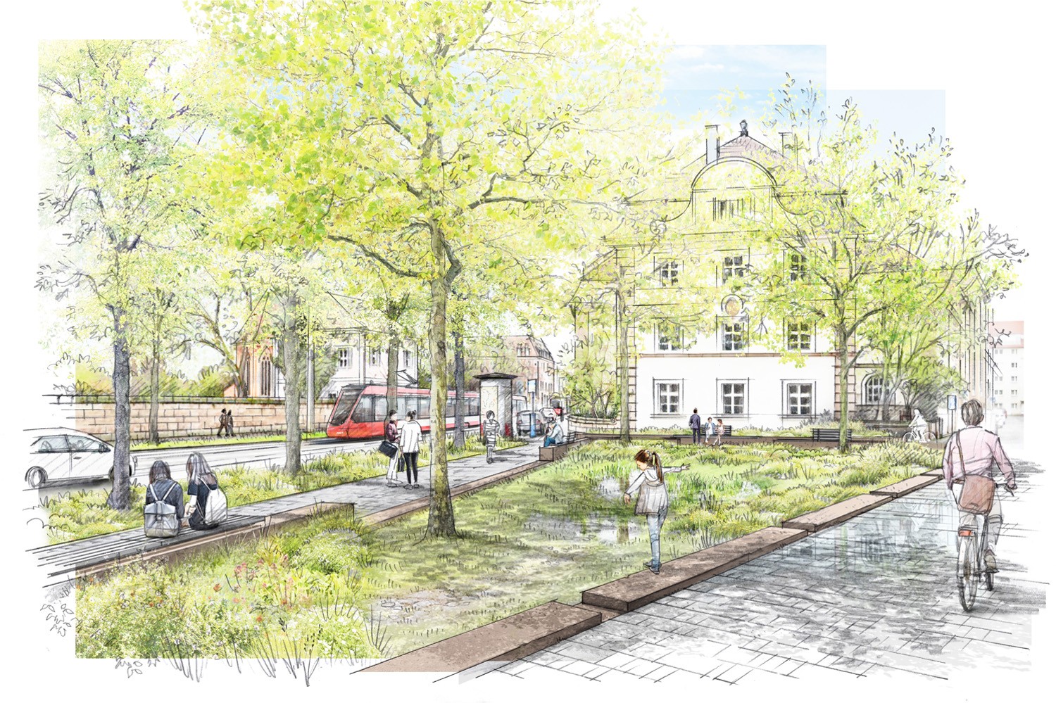 SÖR setzt auf ein Entwässerungskonzept nach dem Schwammstadtprinzip: Die Fläche wird um 30 bis 50 Zentimeter abgesenkt, um eine Mulde auszubilden. Hier sammelt sich das anfallende Regenwasser der befestigten Fläche und versickert. Zu den drei vorhandenen Bestandsbäumen kommen fünf weitere Bäume, um schattige Bereiche zu schaffen.