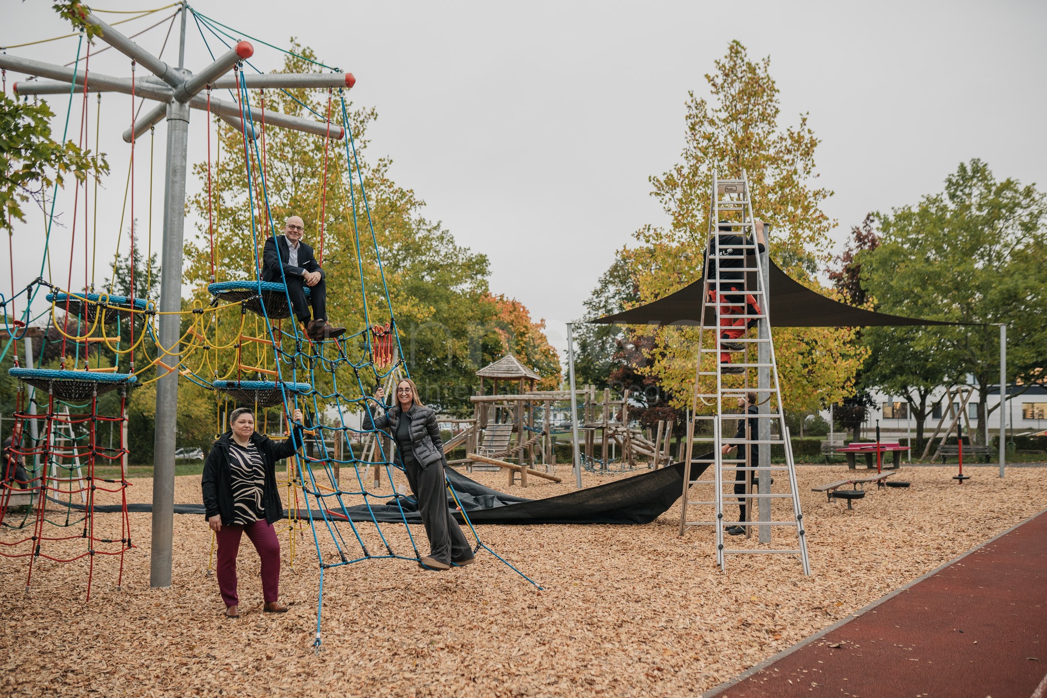 Ergänzend zum Klettergerüst wurden in den Sommerferien Pfosten für zwei Sonnensegel betoniert. Am Mittwoch (09.10.2025) wurden die Sonnensegel probeweise installiert, die künftig in den Sommermonaten Schatten spenden sollen. Über die Wintermonate werden sie wieder abgebaut.